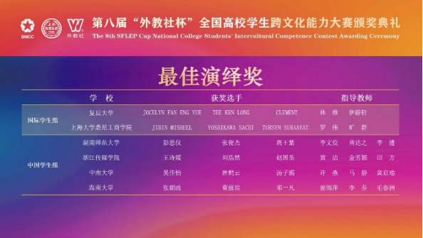 在全国决赛和总决赛的舞台上,参赛团队以多元视角回应时代课题,用青年智慧传递中国温度,展现出当代学生在多元文化情境中凝聚共识的创新与担当。经过决赛环节的案例展示与问答、名言名句解读,海南大学代表队以案例作品“千年万里,海南黎文化的海上丝绸之路”(Weaving Far and Near: Hainan Li Culture on the Maritime Silk Road)成功晋级全国总决赛。在知识问答、情境述评和讲述中国故事三项总决赛环节后,海南大学代表队荣获中国学生组一等奖、最佳演绎奖。