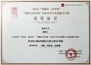“外研社·国才杯”“理解当代中国”全国大学生外语能力大赛对标教育强国建设要求,主动融入国家发展大局,落实立德树人根本任务、全面深化“三进”工作,着力开创高等外语教育事业发展新局面。大赛致力于持续推动高等外语教育改革,助力培养有家国情怀、有全球视野、有专业本领的新时代英才。大赛以“理解中国,沟通世界”为主题,为培养更多能够深入理解当代中国、讲好中国故事、传播好中国声音的高素质国际化人才贡献力量。