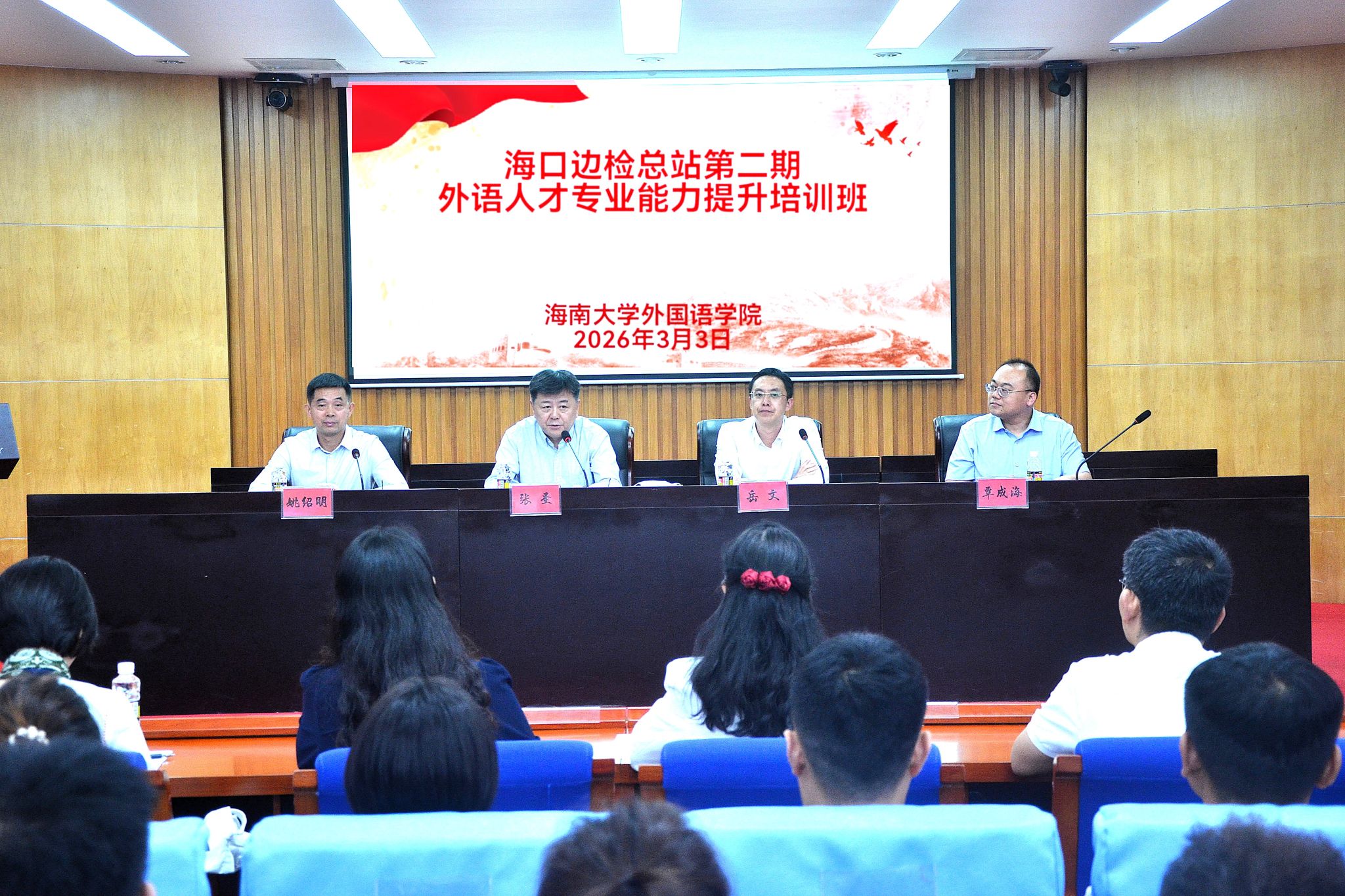 为深入贯彻落实海南自由贸易港高质量发展战略,进一步提升移民管理队伍的外语实战能力,2026年3月3日下午,海口出入境边防检查总站第二期外语人才专业能力提升培训班开班动员会在海南大学海甸校区办公楼一楼报告厅举行。海口边检总站党委副书记、政委张圣,海南大学党委常委、副校长岳文,外国语学院党委书记覃成海出席,全体培训班学员、任课教师参加动员会。海口边检总站党委委员、政治处主任姚绍明主持动员会。