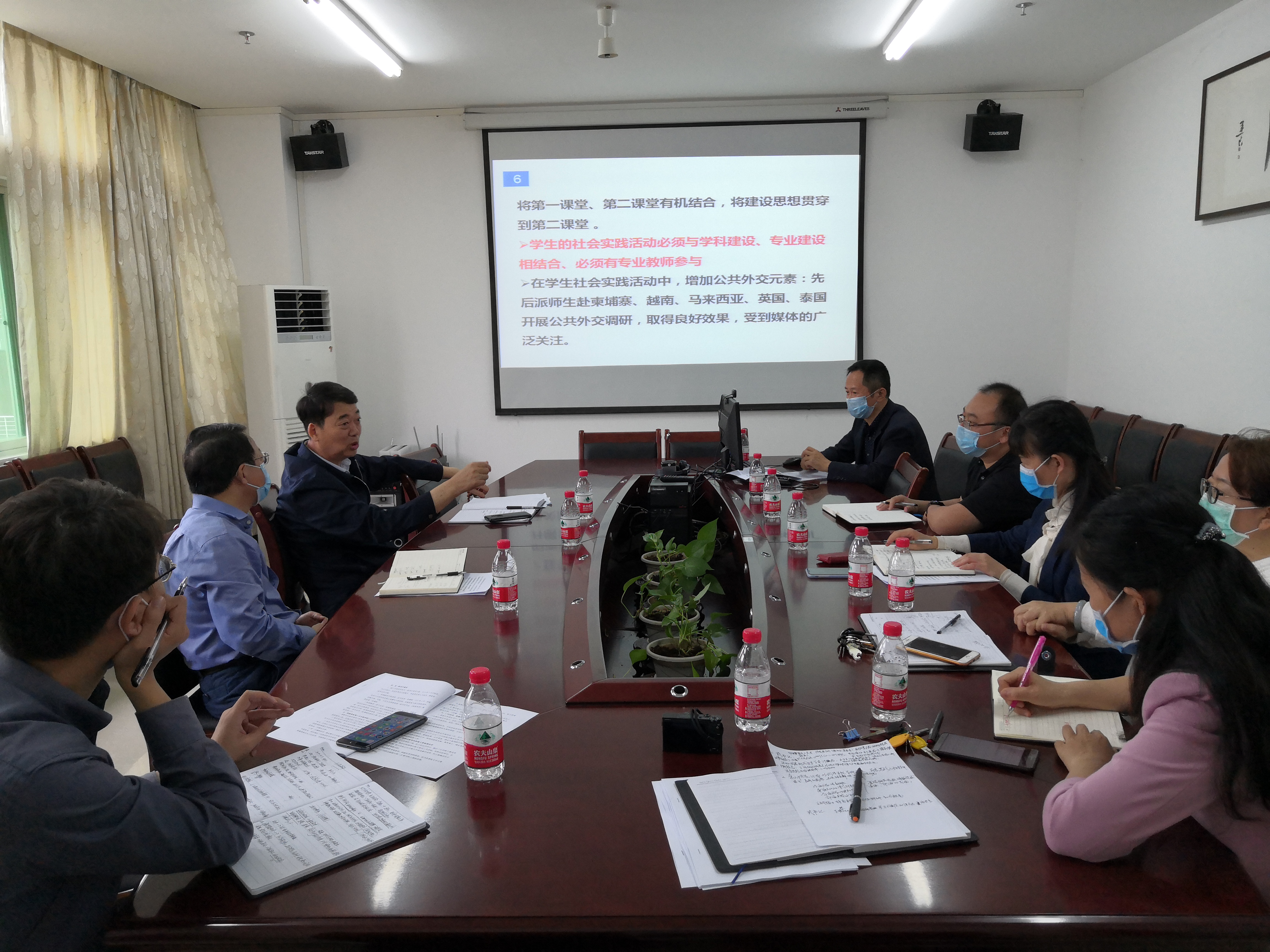 2020年4月9日下午,学校党委书记武耀廷,党委常委、副校长王崇敏到外国语学院调研,党办秘书科科长黎雨苗陪同。外国语学院院长金山,学院党委书记黄丽芹,副院长杨婕、肖艳玲、覃成海,学院综合办主任符壮慈参加调研座谈会。