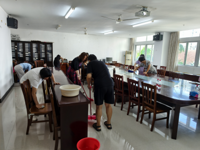 在理论学习的基础上,支部党员躬身实践、净化工作环境,把中央八项规定精神学习融入到实际行动中。大家手持扫把、抹布、拖把等工具,面对积满灰尘的桌椅,仔细擦拭;针对易于藏污纳垢的卫生死角,则采用手抠细扫等方式清洁。尽管劳动任务繁琐,但党员教师们却毫不懈怠,不怕脏、不怕累,专注于每一处细节,以俯身之姿诠释担当,用汗水标注责任刻度。经过一个多小时的不懈奋战,会议室面貌焕然一新,桌椅整洁、窗明几净,再度成为温馨、舒适的工作场所。