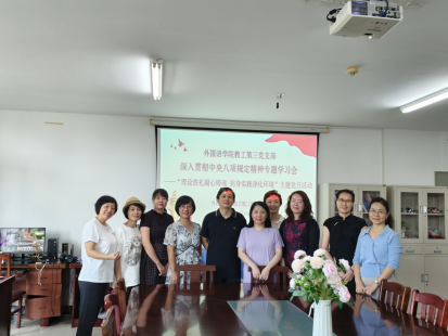 为深入贯彻中央八项规定及其实施细则精神,充分发挥党员干部的先锋模范作用,2025年10月14日下午,外国语学院教工第三党支部在社科楼C415开展“理论洗礼凝心铸魂 躬身实践净化环境”主题党日活动。活动由党支部书记王瑞珍主持,教工第三党支部全体党员参会。